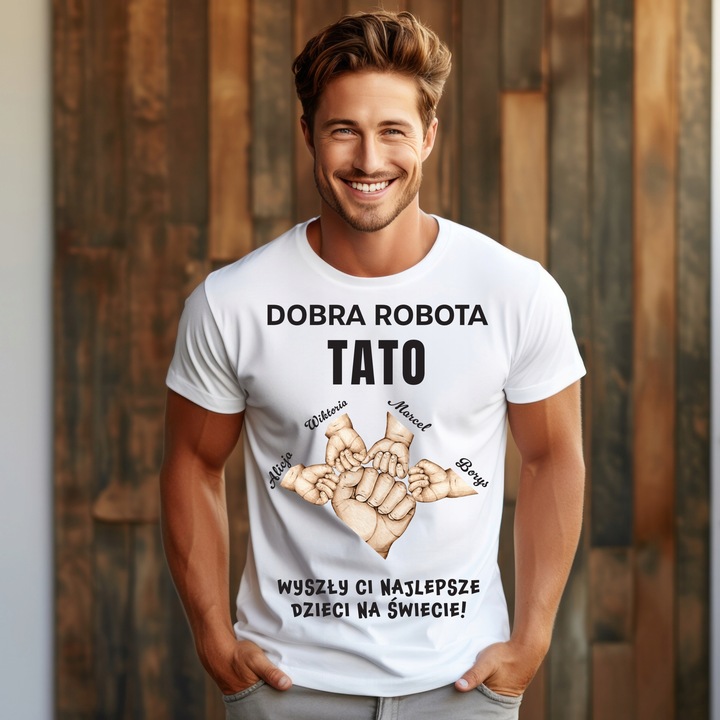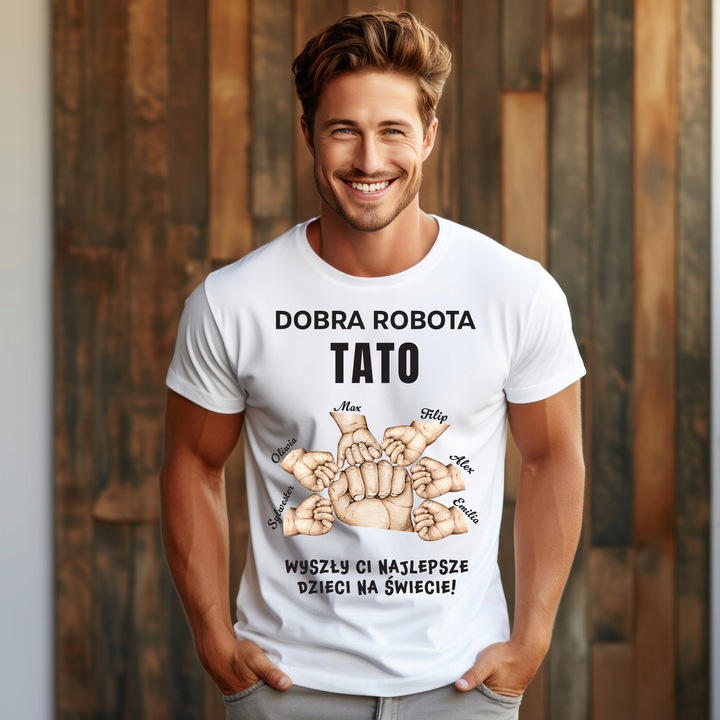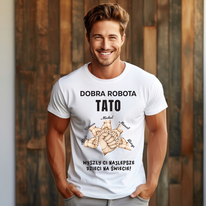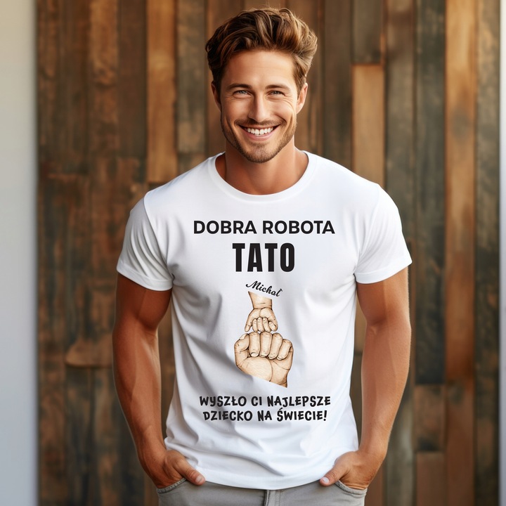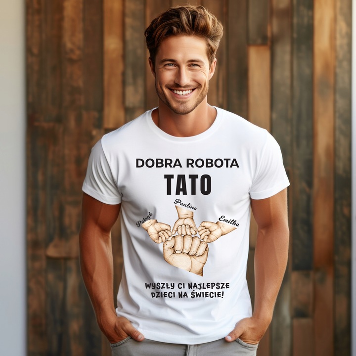 Biala koszulka dla Taty “Dobra robota Tato – wyszly Ci najlepsze dzieci na swiecie”