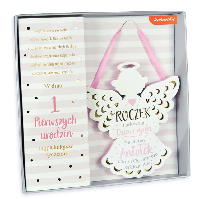 Tekst zyczen: “Roczek cudownej Dziewczynki. Niech ten Aniolek chroni Cie i strzeze kazdego dnia!”